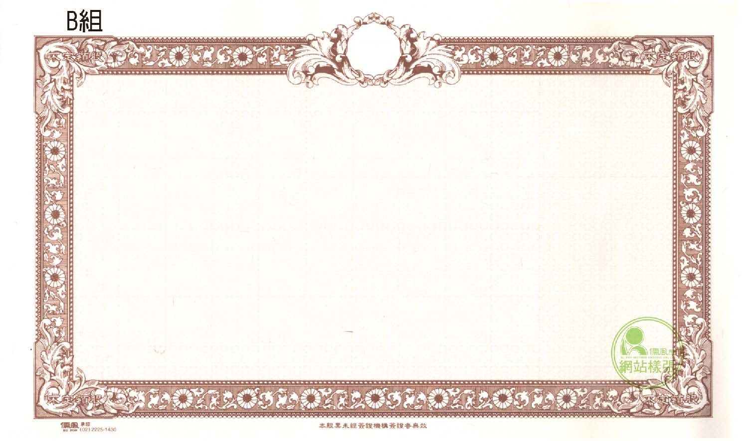 | | 設 計 花 邊 | 公 用 版 | 打 字 件 | | 適用 對象 | 公開發行之公司 | 未公開發行之公司 | 未公開發行之公司 | | 性 質 | 1.符合金管會所規定之標準格式 2.以花邊、底紋為區隔 | 1.不符合金管會所規定之標準格式 2.固定花邊 | 1.不符合金管會所規定之標準格式 2.固定花邊 3.僅做文字套印,印章部分由客戶自行加蓋。 | | 優 點 | 符合金管會規定,是一勞永逸作法。 | 價格經濟 | 價格經濟 | | 缺 點 | 有固定的基本開機費用(永遠都無公開發行之打算) | 依金管會準則,一旦採公開發行就得全面換票。 | | 特性 | 採用100磅證券專用紙,內含浮水印、滿天星、不規則螢光絲及防塗改變色系統,可用肉眼及輔助工具辨識,具高難度之防偽功能 | |
